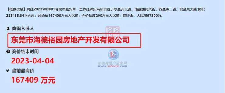 4月4日,东莞今年首宗城市更新单一主体挂牌招商项目(编号2023WD001),由东莞海德地产以总价16.74亿元拿下。
