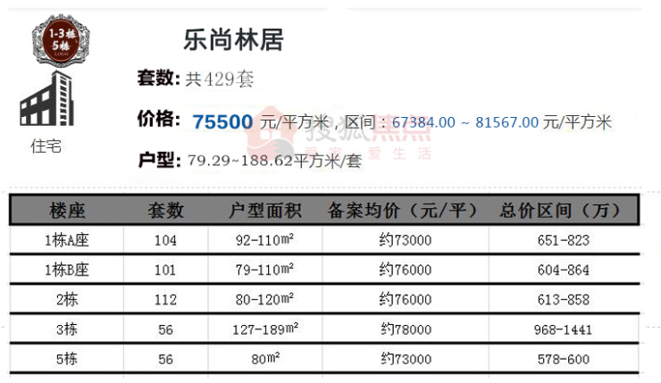 从备案系统上获悉,乐尚林居户型面积区间为79.29-188.62㎡,备案均价为75500元/平,单价区间为67384-81567元/平,总价区间为578-1441万。