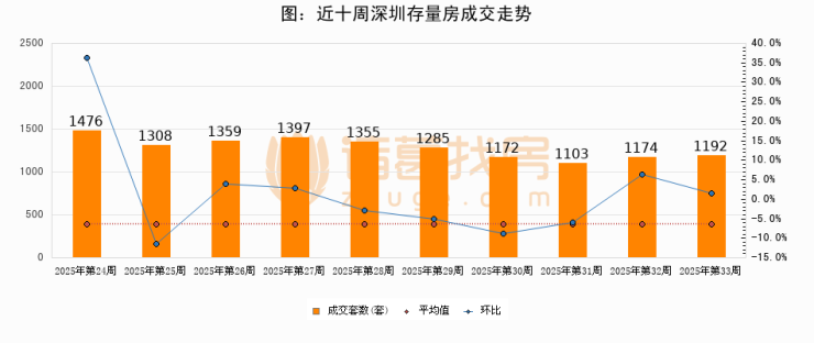 存量房方面,第33周深圳存量房成交1192套,较上周增加18套,环比上涨1.5%。从近十周成交走势来看,周均成交套数为1282套,本周低于平均水平7%。