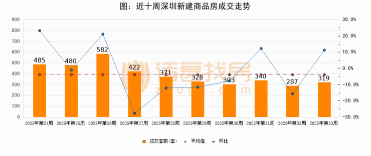 进入2025年第33周(08月11日-08月17日),深圳新建商品房成交319套,较上周增加32套,环比上涨11.2%