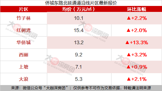 新通道经过福田竹子林;南山红树湾、华侨城、西丽;龙华上塘、大浪6个片区,目前各片区业主报价情况如下。
