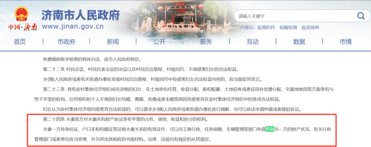 据济南市人民政府官网显示,2011年1月发布的《济南市妇女权益保障若干规定》第二十四条显示:夫妻一方持身份证、户口本和结婚证等证明夫妻关系的有效证件,可以向工商行政、住房保障、车辆管理等部门申请查询另一方的财产状况,有关行政管理部门或者单位应当受理,并为其出具相应的书面材料。该《规定》第三十五条表示:《规定》自2011年5月1日起施行,并未写明有效期。