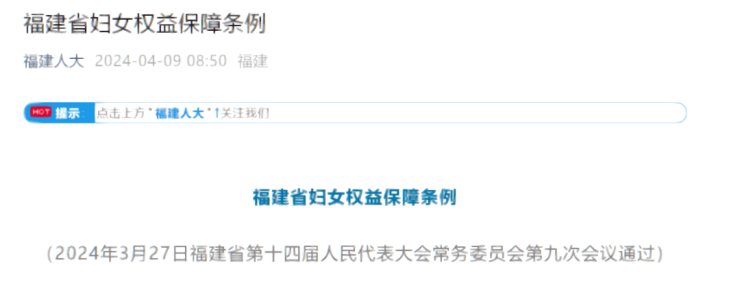 据微信公众号“福建人大”4月9日发文显示,2024年3月27日,福建省第十四届人民代表大会常务委员会第九次会议通过《福建省妇女权益保障条例》(以下简称“条例”)。