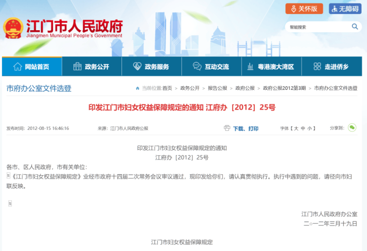 该《规定》自2012年5月1日起施行,有效期5年,《江门市妇女权益保障若干规定》(江府[1996]56号)同时废止。