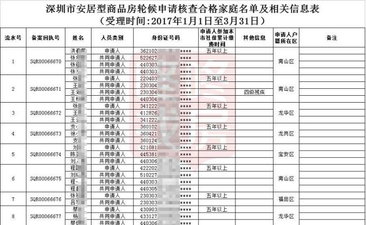 附件:深圳市安居型商品房轮候申请核查合格家庭名单及相关信息表(受理时间:2017年1月1日至3月31日)
