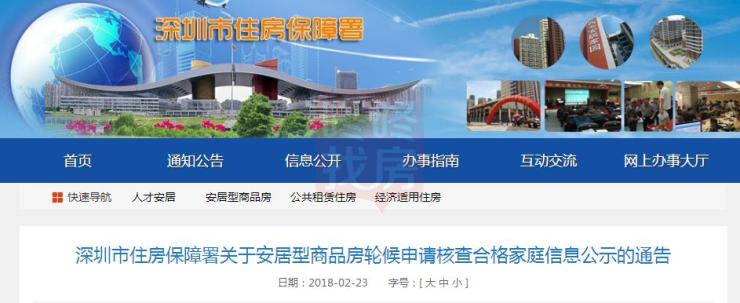 深圳市住房保障署2018年1月23日,发布《关于安居型商品房轮候申请核查合格家庭信息公示的通告》,本次对2017年1月1日至3月31日受理的8709户安居型商品房轮候申请家庭(含单身居民,下同)进行了核查,合格家庭共8179户。