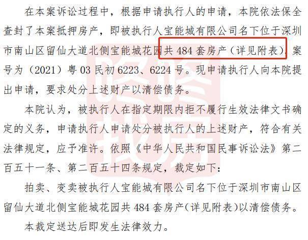 法拍公布文件显示,宝能名下宝能城484套房产将拍卖、变卖,用以清偿平安银行债务。