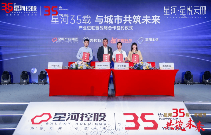 随后星河产业集团总裁陈忠先生代表星河方,与沙拉食刻(广东)食品科技有限公司、玄智(深圳)科技有限公司、北京高阳金信信息技术有限公司等近期进驻星河WORLD园区的企业,进行战略合作签约仪式。