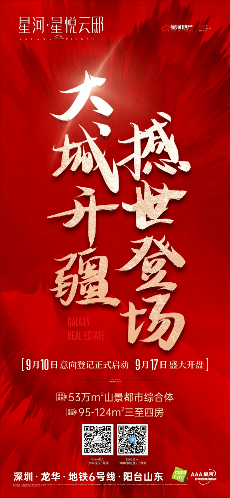 本次推出849套95-124㎡臻品住宅,已于9月10日开始i深圳诚意登记,9月17日即将盛大开盘,期待星河再次引爆市场!