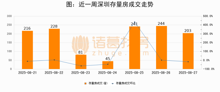 从存量房来看,2025年08月27日深圳存量房单日成交203套,比昨日减少41套,环比下降16.8%。从近一周存量房成交来看,深圳存量房日均成交套数为179套,08月27日单日成交203套,高于近一周平均水平13.4%。