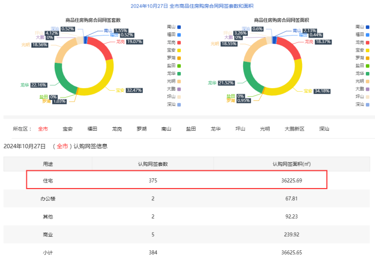 2024年10月27日新房住宅认购网签375套。宝安50套;福田2套;龙岗40套;罗湖5套;南山38套;盐田4套;龙华104套;坪山6套;光明126套;大鹏0套;深汕0套。