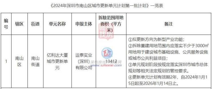 1月15日,《2024年深圳市南山区城市更新单元计划第一批计划》的公告;此批计划仅亿利达大厦城市更新单元在列,项目拆除面积13412平方米。