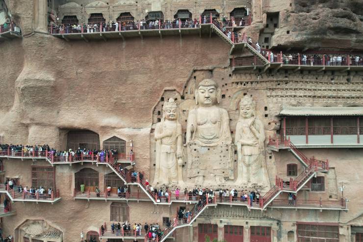 4月5日,游客在位于天水市麦积区的麦积山石窟游览 图片来源:新华社