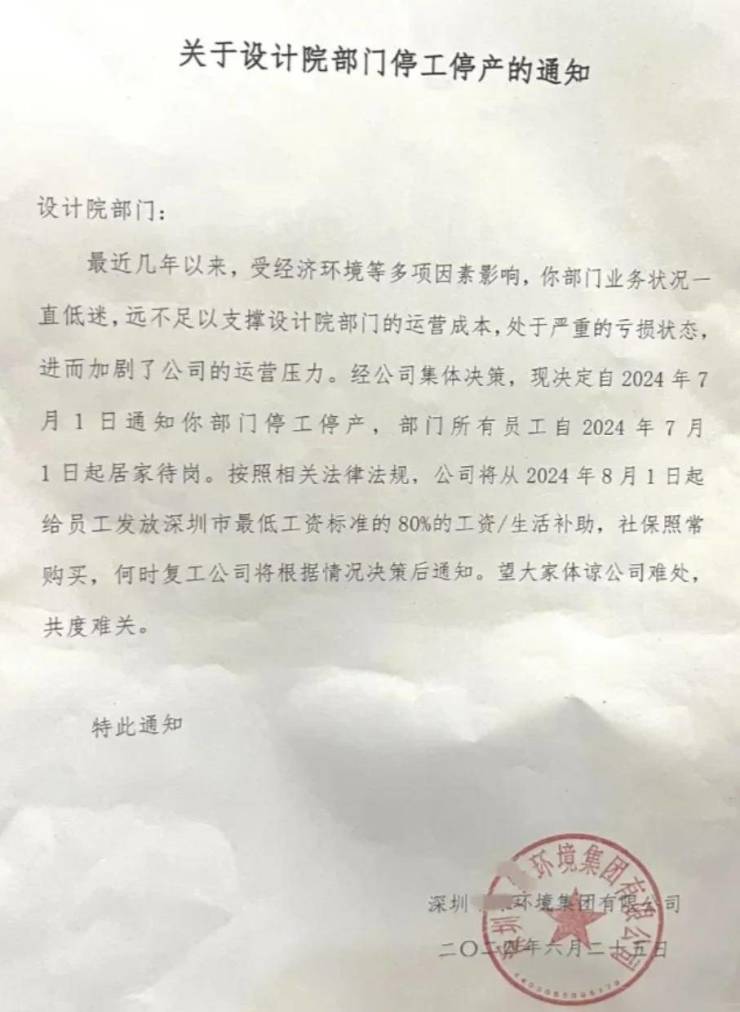 在有关社交平台上,有网友贴出一张盖有深圳某环境集团有限公司公章的通知,该份通知指出,“经公司集体决策,现决定自2024年7月1日通知你部门停工停产,部门所有员工自2024年7月1日起居家待岗。按照相关法律法规,公司将从2024年8月1日起给员工发放深圳市最低工资标准的80%的工资/生活补助,社保照常购买,何时复工公司将根据情况决策后通知。”