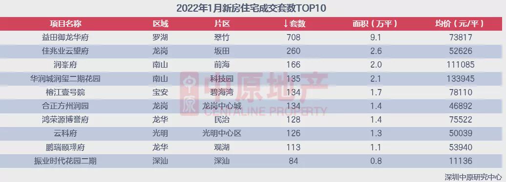 网签数据显示,1月益田御龙华府网签708套,位居住宅成交套数TOP10榜首,其次是佳兆业云望府、润峯府。1月网签套数TOP10项目中,南山、龙华、龙岗各占据2个,罗湖、宝安、光明、深汕各1个。