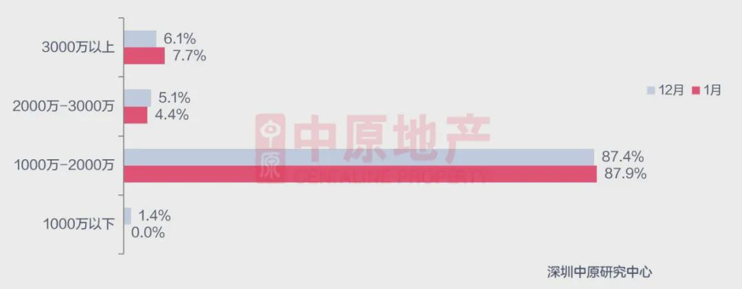 网签数据显示,1月,1000-2000万以及3000万以上价段成交占比上升,其余两个价段成交占比下滑。其中,3000万以上成交占比上升1.6%至7.7%,此价段华润城润玺二期、深圳中心天元等项目为成交主力。1000-2000万价段成交占比小幅上升至87.9%,主要为润峯府、华润城润玺二期的成交。