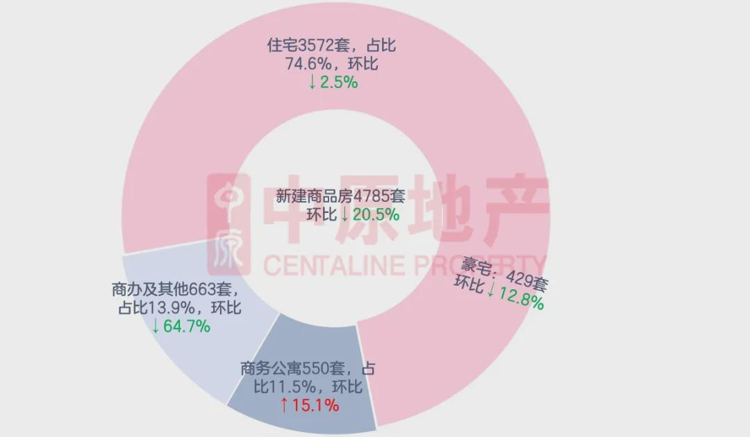 其中,住宅成交占比74.6%,略有下滑;商务公寓成交占比11.5%,环比上升15.1%;商办及其他占比13.9%,环比下滑64.7%。