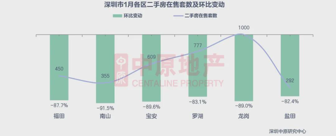 1月龙岗二手房在售套数为1000套,占全市供应量的28.7%,位居首位。罗湖区在售套数为777套,供应量位居第二。