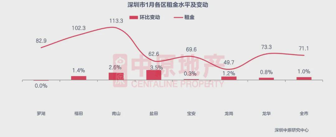 1月各区租金变化看,仅罗湖区租金与上月持平,其他六区租金都有不同的程度上升。其中,盐田区租金上升3.5%,升幅较大。