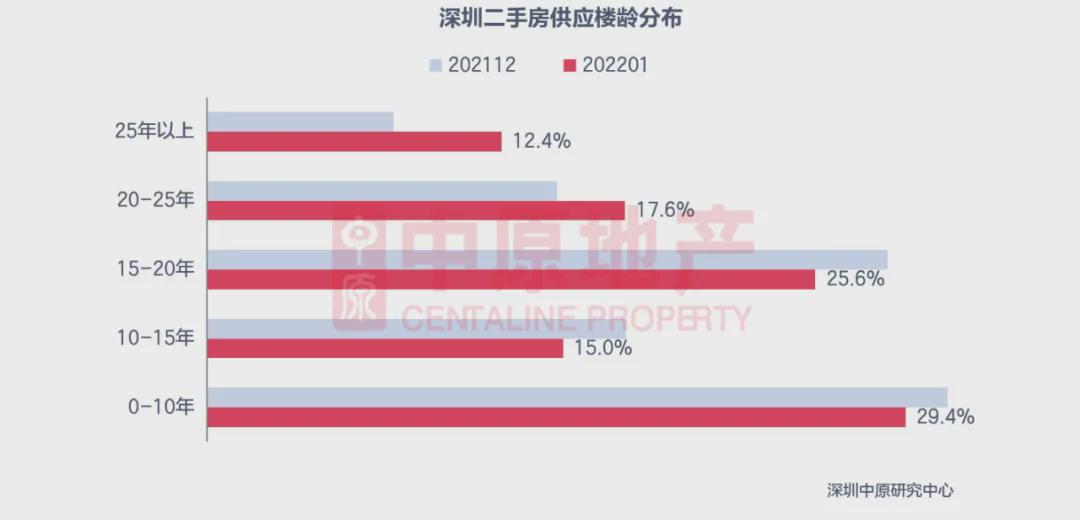 从楼龄来看,0-10年的二手房供应量较大,供应占比为29.4%。25年以上的老房源供应占比最小,为12.4%。