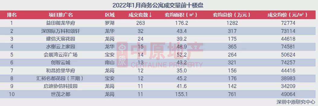 1月,公寓项目成交量TOP10榜单中,益田御龙华府位居成交量榜首,共成交263套,单项目成交套数占本月成交总套数47.8%。前十榜单中龙岗占四席,龙华、宝安两席,罗湖、南山各占一席。