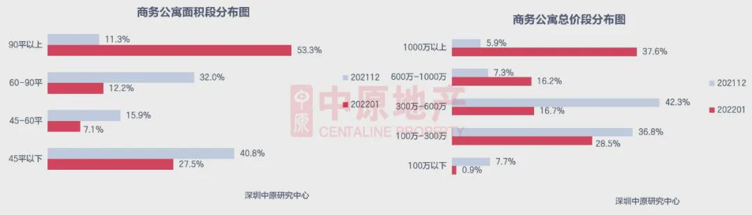 1月,总价段“1000万以上”成交占比37.6%,上升31.7%;“600-1000万”成交占比↑8.9%,中低价段占比皆有下滑。