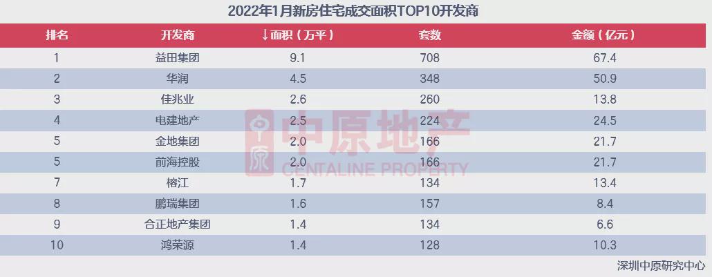 1月,益田集团凭借益田御龙华府项目,网签9.1万平,位居开发商成交面积TOP10榜首,其次是华润、佳兆业。