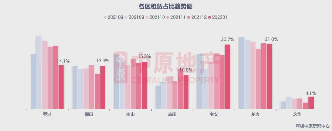 1月龙岗区租赁占比21.0%,是租赁占比较大的区域;宝安区紧随其后,占比20.7%。
