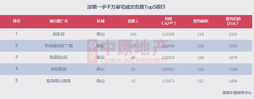千万豪宅中,南山区的润峯府网签166套,位居1月千万豪宅成交量榜首;华润城润玺二期、海德园B区分居二三位。千万豪宅成交TOP5中4个为南山项目。