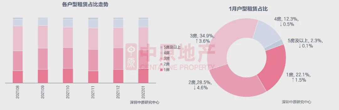 1月3房租赁成交占比较高,超过3成,为34.9%。