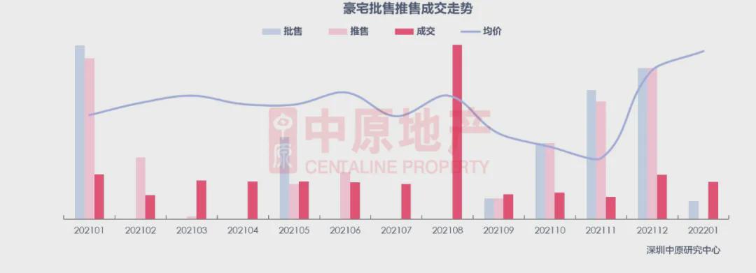 1月一豪宅项目获批,为华侨城新玺。一手豪宅共成交429套,环比下滑12.8%;成交面积为5.88万平,环比下滑16.1%。成交均价为120934元/平,环比↑3.0%。