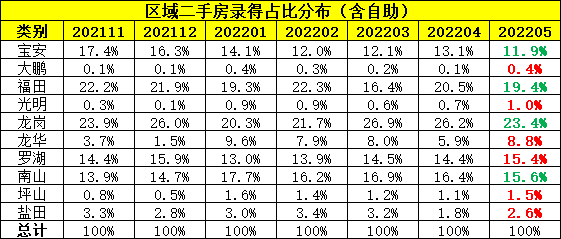 整个1-5月份,二手房卖得较好的片区是龙岗,刚需占比大,因为龙岗的指导价与市场价基本差不多;其次是福田和南山,以及罗湖,福田、南山主要是因为改善置业者和豪宅买家为主,罗湖还是要为价格相对便宜。