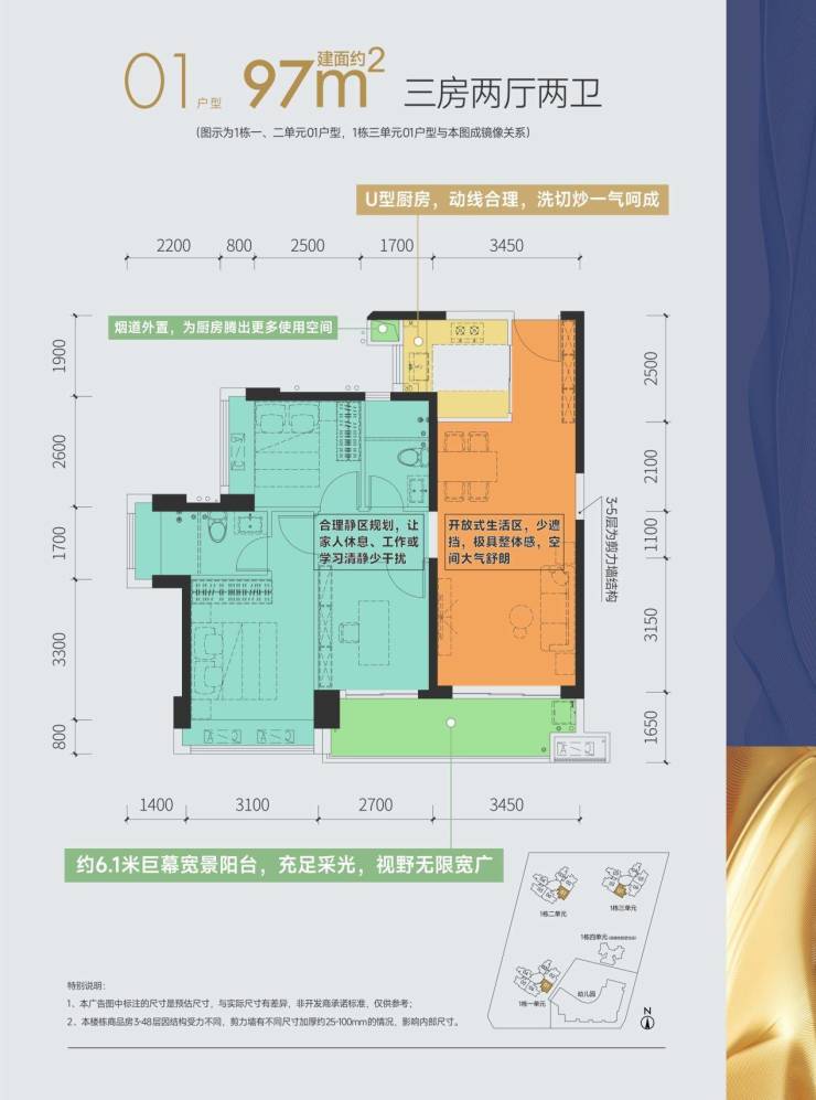 建筑面积约97㎡三房两厅两卫产品则拥有约6.2米宽境瞰景阳台,让视野更开阔;动静分离的布局,让休息与娱乐空间互不打扰。客餐厅一体,联通超大阳台,通透性、尺度感拉满。不同角度的飘窗让室内每个角落都能明亮起来,厨房利用飘窗,做到了U型设计,可以容纳多人同时作业。