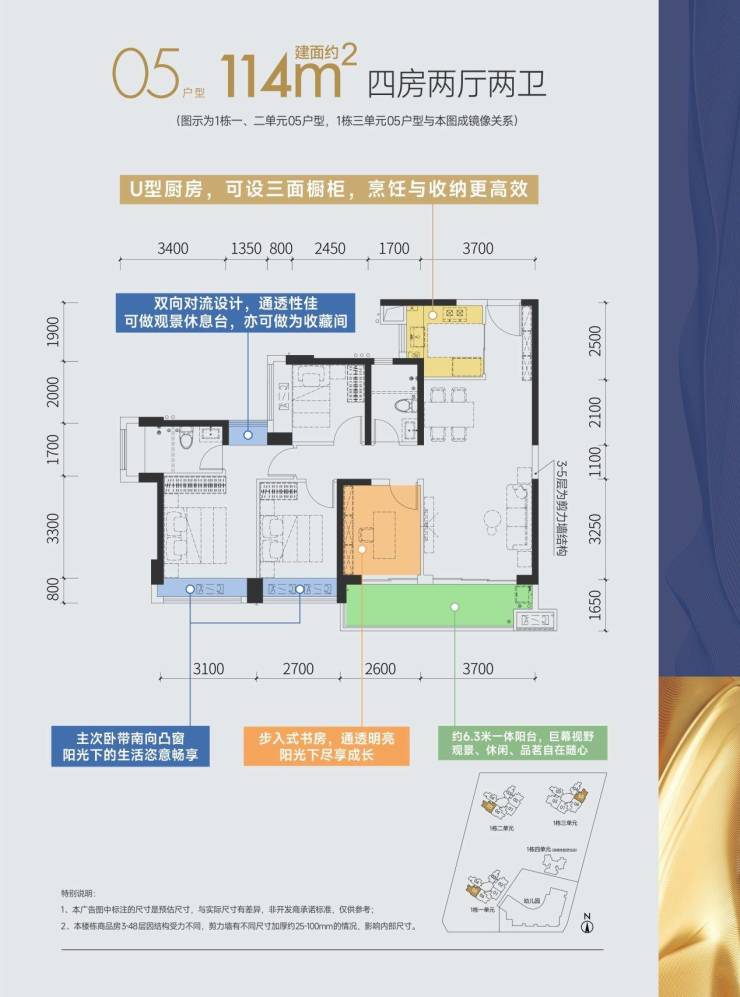 建筑面积约114㎡四房两厅两卫产品,拥有6个飘窗≈7.77㎡,计一半面积的阳台≈4.95㎡,114㎡可以住出126㎡才有的品质居住舒适感。