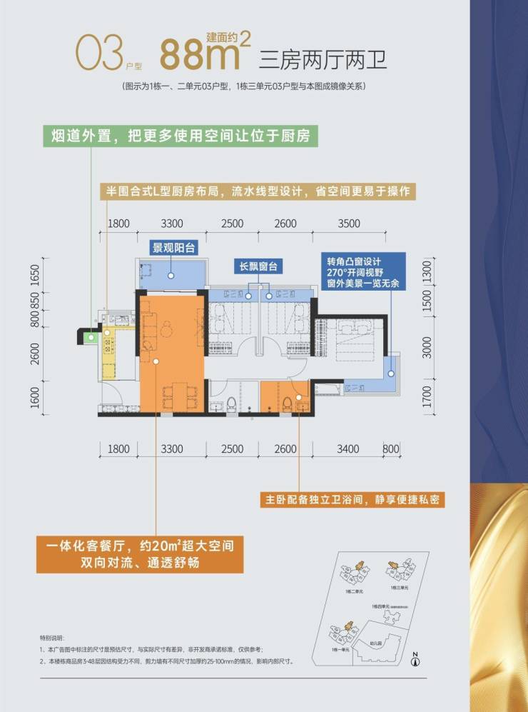 比如建筑面积约88㎡三房两厅两卫产品,客餐厅一体设计,联通面宽3.3米的大阳台,让尺度感与实用率最大化。同时,卫生间采用非常实用的“一字型”设计,这样的设计既能够节省空间,在日常使用中也非常方便,促使这个面积段也能拥有2个货真价实的卫生间,让生活更从容。主卧还有L型飘窗,不仅拥有270°全景,纳四时风景入室,并且还很实用性,可以作为梳妆台或休闲区。