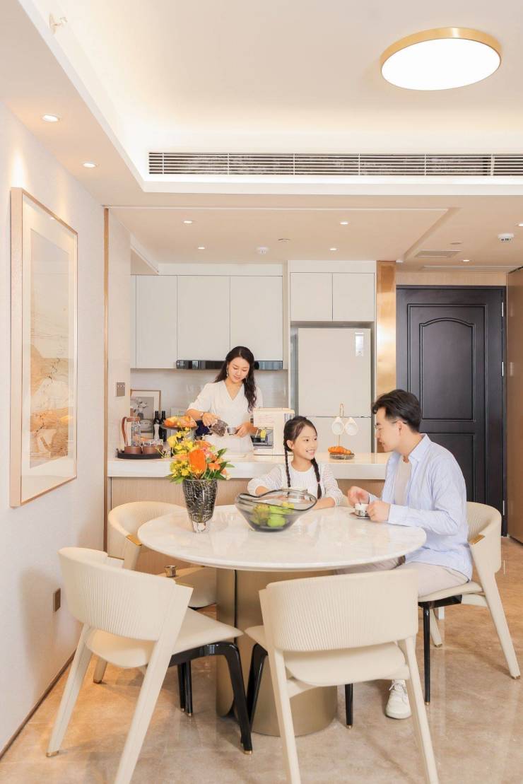 同时,客厅还可通过打通旁边的次卧,让整个动区更通透,整体视野更好,实现客厅与孩子的游乐区联通,既能随时观察孩子的玩乐情况,又能够享受自己的闲暇时光。同时,打通后整体形成一个豪宅级别的待客空间,尺度感拉满。闲暇时光,可邀三五好友到家中做客,不亦乐乎;传统佳节,更可与亲朋家中共进晚餐,共叙家常。