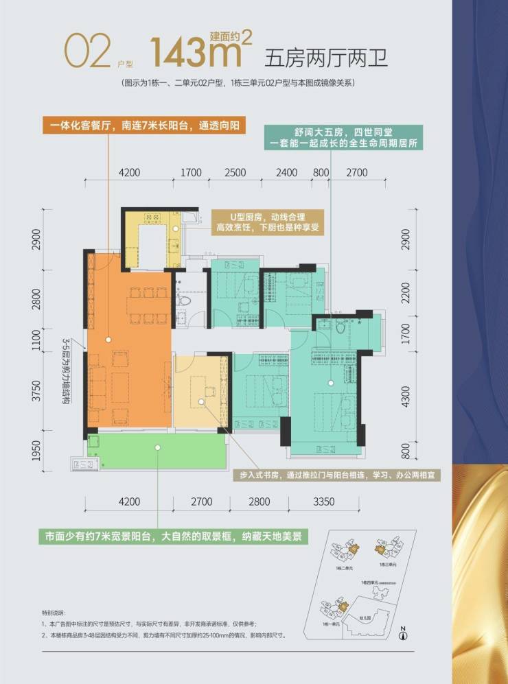 建筑面积约143㎡五房两厅两卫产品,是市面上少见的五房设计,在约114㎡户型所有功能上,全面升级。