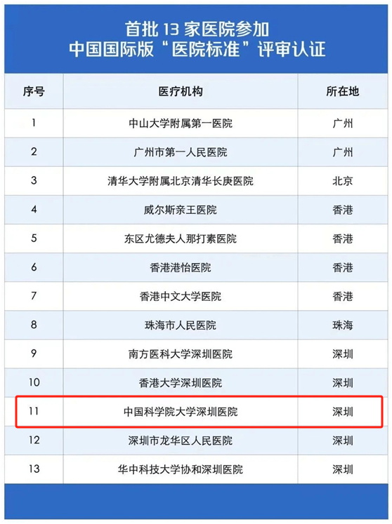 值得一提的是,国科大深圳医院正在创建“国际版三甲医院”。2023年3月,国科大深圳医院成功入选参加《医院质量国际认证标准(2021版)》评审认证,全国首批仅有13家医院入选。