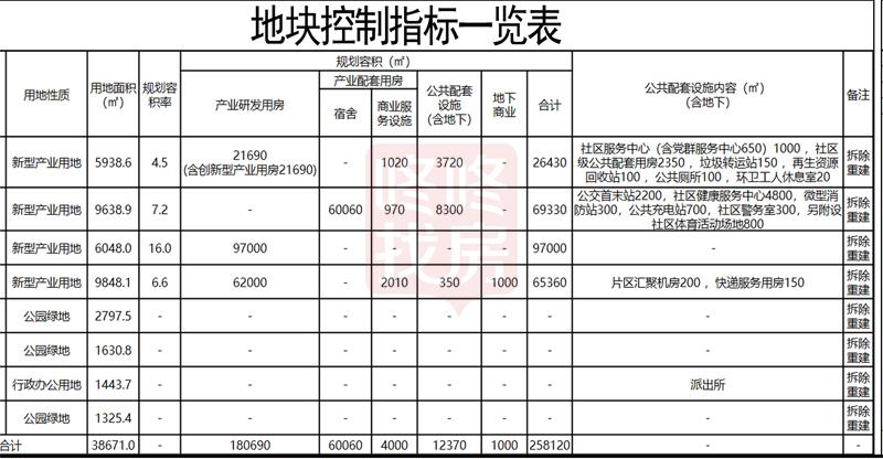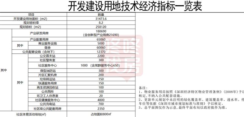 规划容积258120㎡,其中产业研发用房180690㎡(含创新型产业用房21690㎡),产业配套用房65060㎡(含小型商业服务设施5000㎡、配套宿舍60060㎡),公共配套设施(含地下)12370㎡(含公交首末站2200㎡,社区服务中心1000㎡(含党群服务中心650㎡),社区警务室300㎡,微型消防站300㎡,片区汇聚机房200㎡,快递服务用房150㎡,垃圾转运站150㎡,再生资源回收站100㎡,公共厕所100㎡,环卫工人休息室20㎡,社区健康服务中心4800㎡,公共充电站700㎡,社区级公共配套用房2350㎡),另配建社区体育活动场地占地面积800㎡。