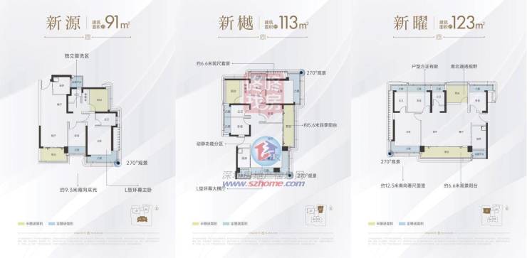 项目为39层高的独栋单体楼,总建面约2.5万㎡,其中住宅建面约1.39万㎡,商业389㎡,三梯四户,规划约131户。主力户型为建面约91-113-123㎡3-4房,约3.1米户内层高,新规设计户型,户户坐北朝南,高层可观前后海天际线。
