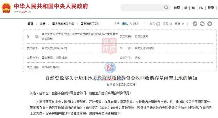 2024年11月,自然资源部发布该通知,通知提到,运用专项债券资金收回收购存量闲置土地,是减少市场存量土地规模、改善土地供求关系、增强地方政府和企业资金流动性、促进房地产市场止跌回稳的关键举措。