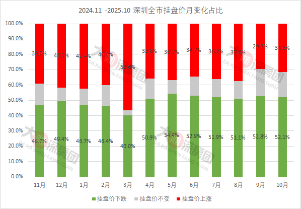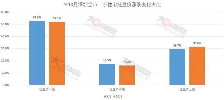 中原的数据显示,10月深圳下跌楼盘占比52.1%,上涨楼盘占比31.6%,几乎不变的小区占比16.3%。