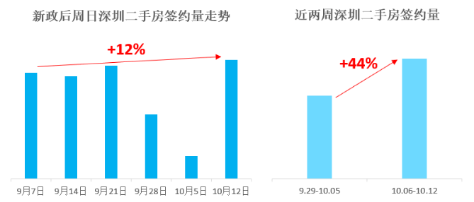 另一家机构,贝壳研究院也监测到,10月6日-10月12日期间,贝壳深圳合作门店二手房签约量,较前一周增长44%,增幅创下今年2月底以来最高水平。