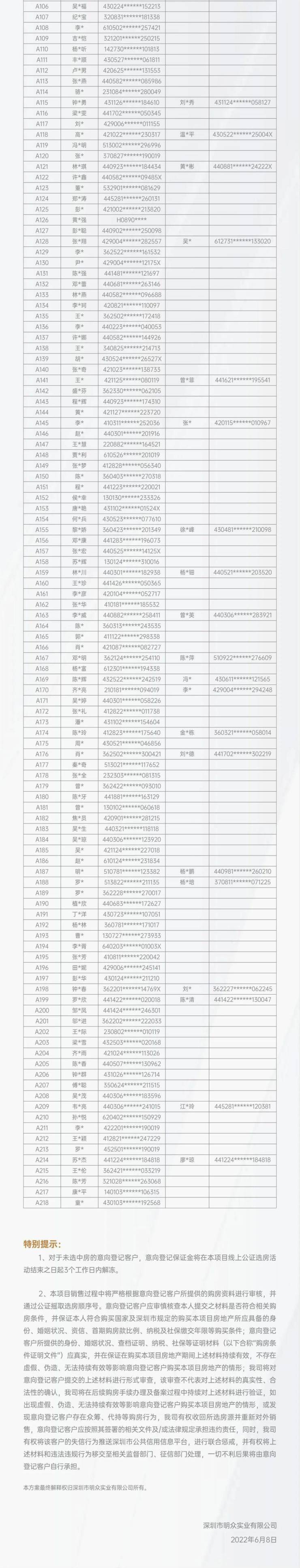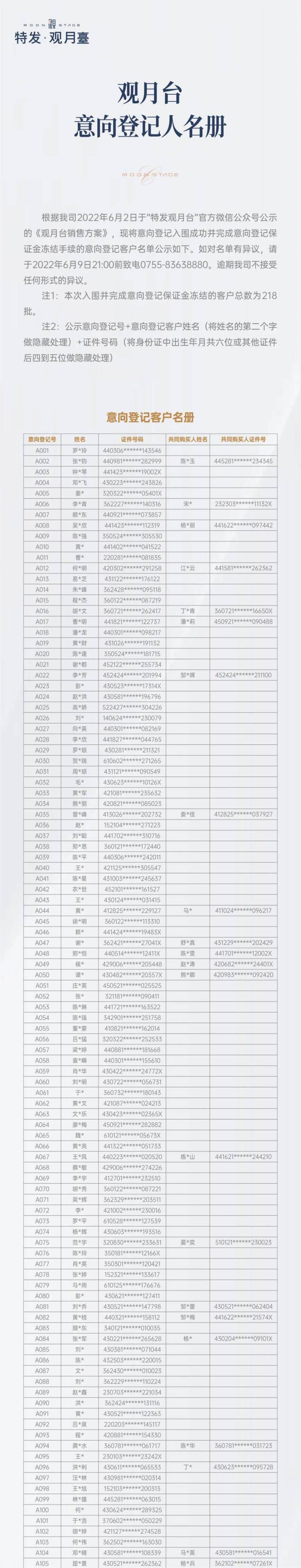 6月8日晚,光明特发观月台公示意向登记人名册,入围客户总共218批(文末附名册)。项目将于6月10日,在前海公证处进行公证摇号。