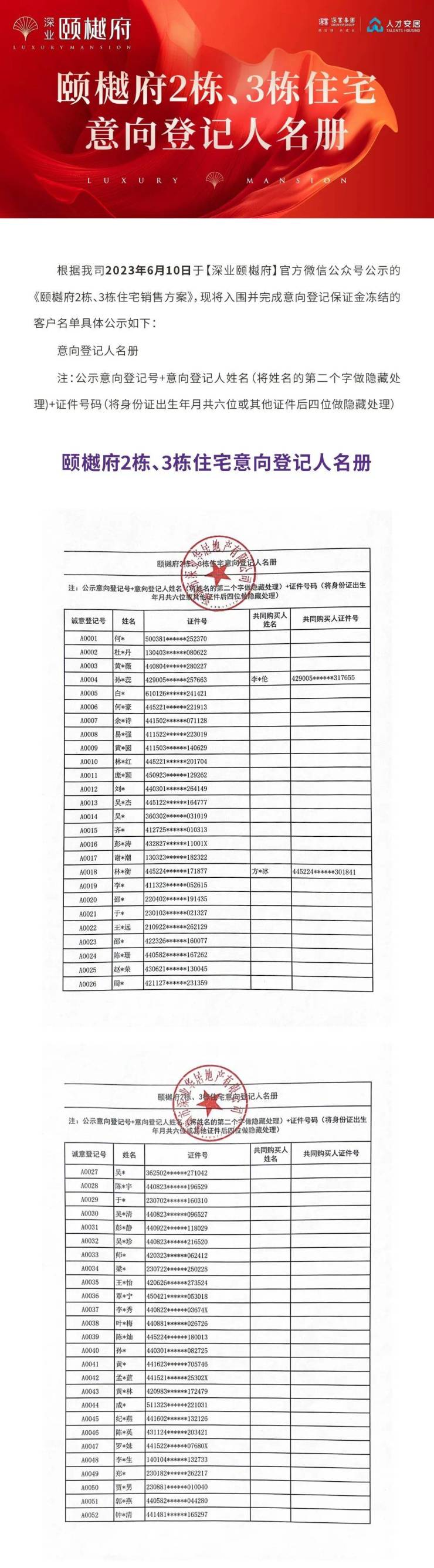 6月14日,深业颐樾府发布《2栋、3栋住宅意向登记人名册》,共登记232批客户,项目今日公证摇号,6月16日,线下公证选房。