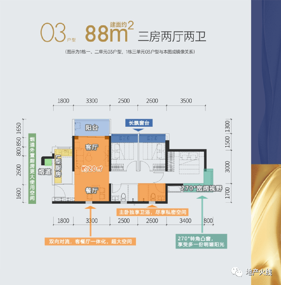 88㎡户型体现了很强的设计感,如主卧凸窗设计成L型,视野和实用性大大提高4个飘窗≈6.24㎡,还有计一半面积的阳台≈2.72㎡,相当于88㎡住出了100㎡的尺度感。