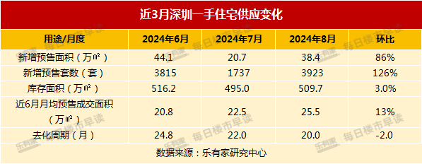 乐有家研究中心监测显示,8月开发商入市积极性明显增强,全市新增一手住宅预售套数3923套,环比上涨126%。近6个月新房市场预售成交面积上涨,从而助力8月底深圳新房去化率减少至20个月,环比缩短了2个月。