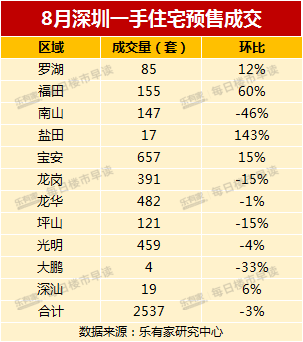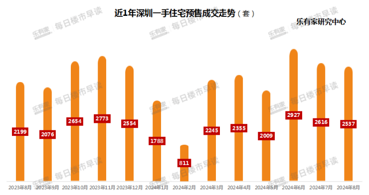 8月深圳一手住宅网签(预售成交量)2537套,环比下跌3%,同比上涨15%。