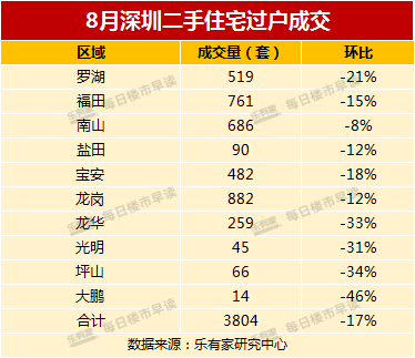 龙岗区8月二手住宅过户882套,排名第一;福田及南山分列二三名,过户量分别为761套和686套。全市单月过户量超过500套的区域还有罗湖,为519套。