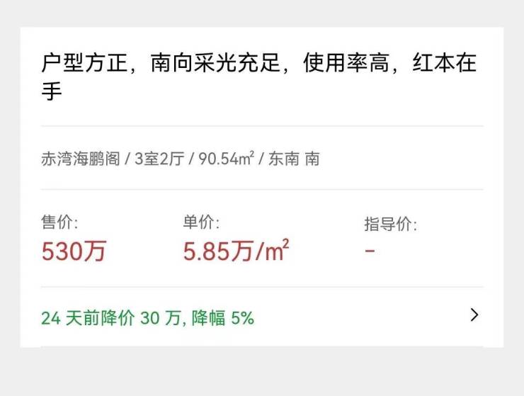 2015年建成的赤湾海鹏阁,目前有一套3房挂牌价为5.85万/㎡,而同片区在售的人才房深铁熙府,整体的均价在5.93万/㎡。